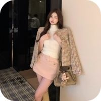HB7058 Women's 2025 Autumn/Winter New Style High-Waisted Skirt Set with Floral Pattern Long-Sleeved Jacket and Inner Layer Vest