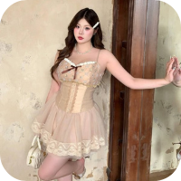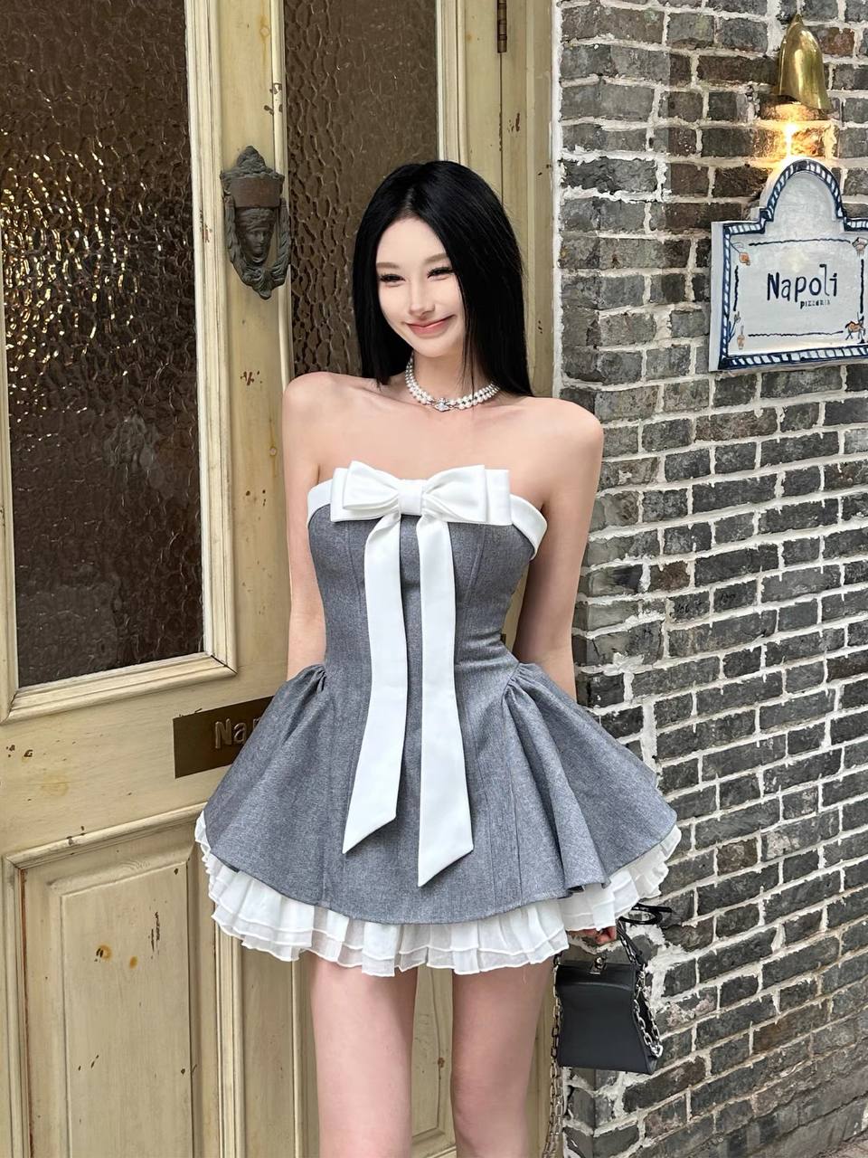 HBP17 Plus-size women's summer cute and sweet princess dress, high-waisted A-line short school style patchwork dress with a slimming waist