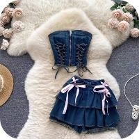 HB7019 Stylish and chic European and American style: Mid-length denim jacket with bow tie and lapel paired with a fitted mini skirt set.