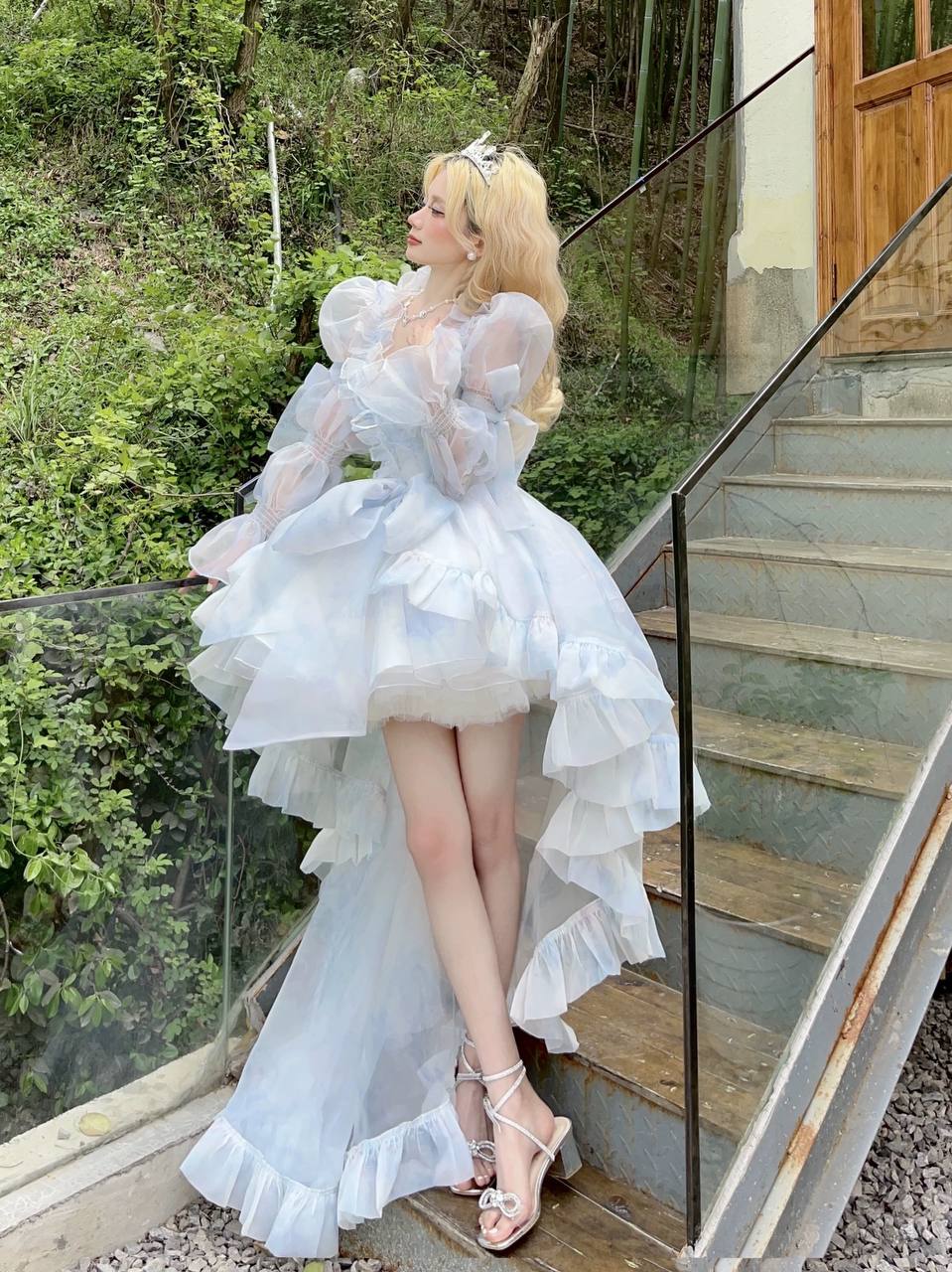 HBK51 Girls' Summer Puff Sleeve Princess Dress, New Summer Style, Tutu Skirt, Children's Rainbow Gradient Color Dress